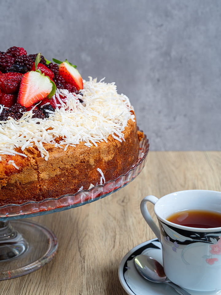 a beautiful old fashioned coconut cake piled high with plump blackberries and freshly squeezed lemon syrup